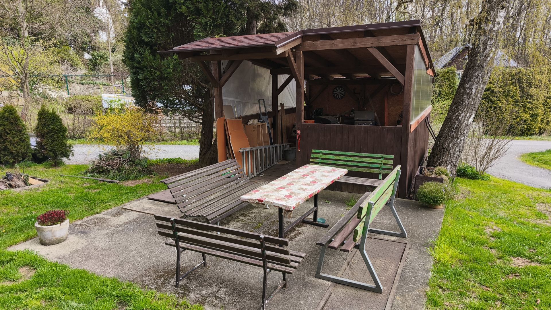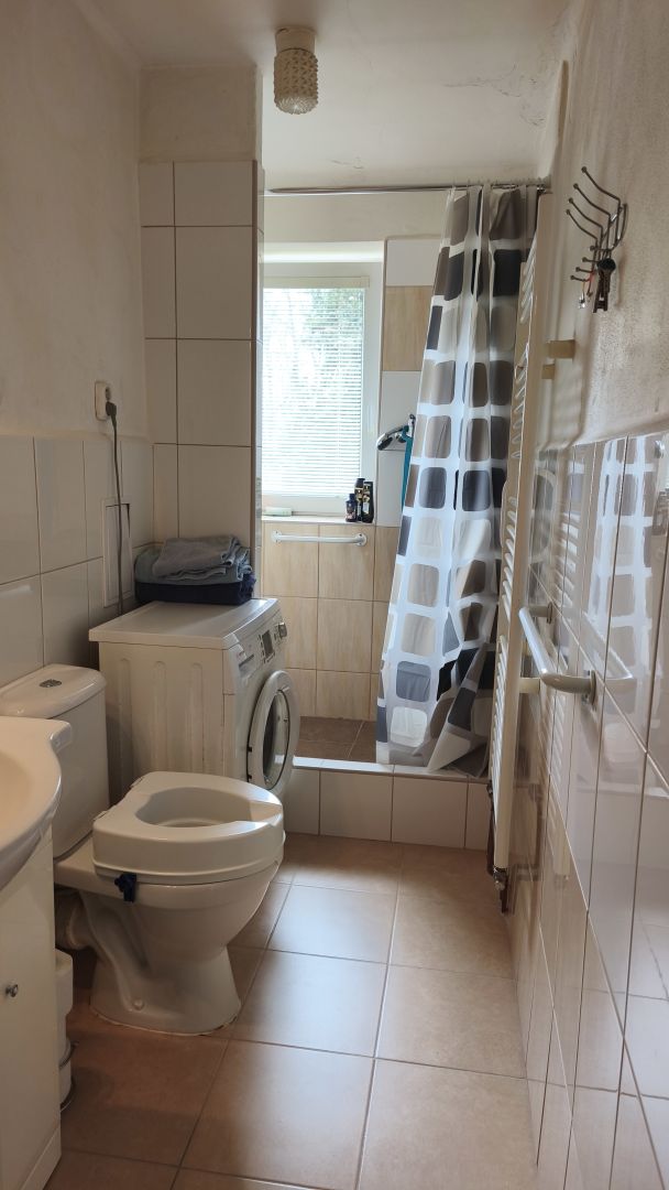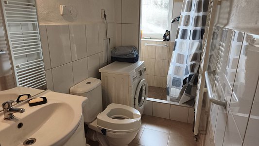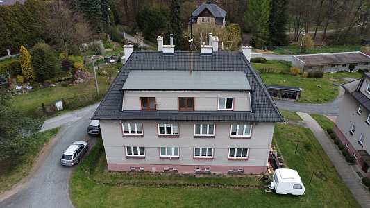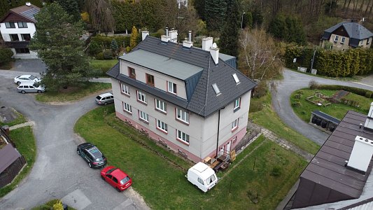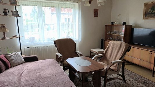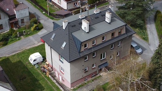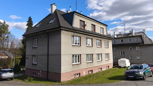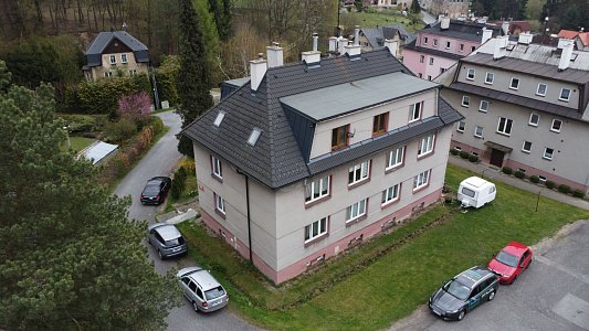 Byt se nachází ve zvýšeném podsklepeném přízemí menšího cihlového bytového domu, který má střechu po rekonstrukci s novou střešní krytinou i opravené komíny a je pečlivě udržován. V domě je do 2. podlaží instalovaná plošina pro manipulaci s invalidním vozíkem a patří k němu i pergola s grilem pro posezení rezidentů