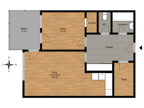 Byt je slunný, středový s velkým balkonem ca 9 m2, který je orientován na jihovýchod a nachází se ve 2.patře budovy s prostorným výtahem. Součástí bytu je kuchyňská linka včetně spotřebičů, skříň v předsíni, prostorná šatna i komora u pokoje s balkonem. Byt je ve slušném stavu a ihned k nastěhování. Dům má centrální vytápění a ohřev vody, před domem je zastávka autobusu MHD, v místě jsou restaurace, hotel a obchody, převážně spojené se sportovními aktivitami, Gymnázium Jeronýmova, vjezd na dálnici Liberec – Praha a veškerá občanská vybavenost.
