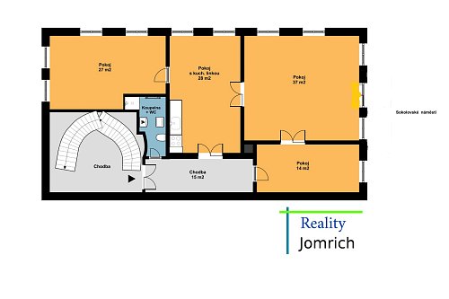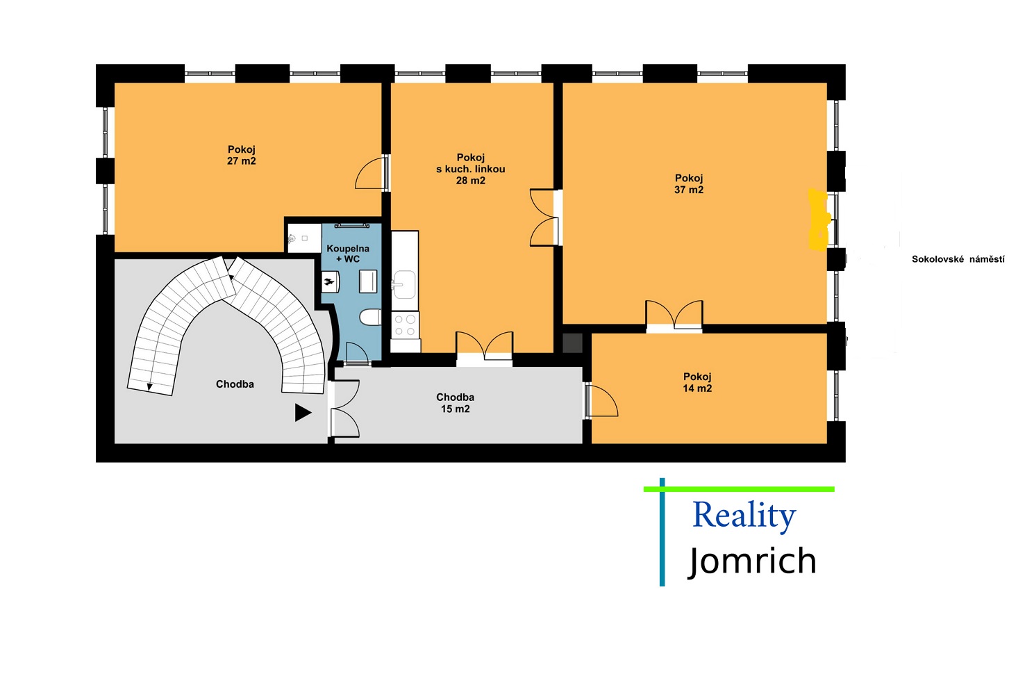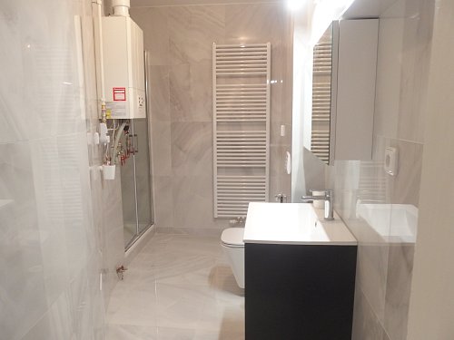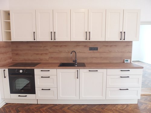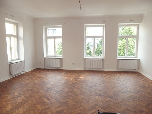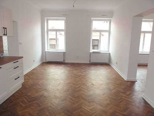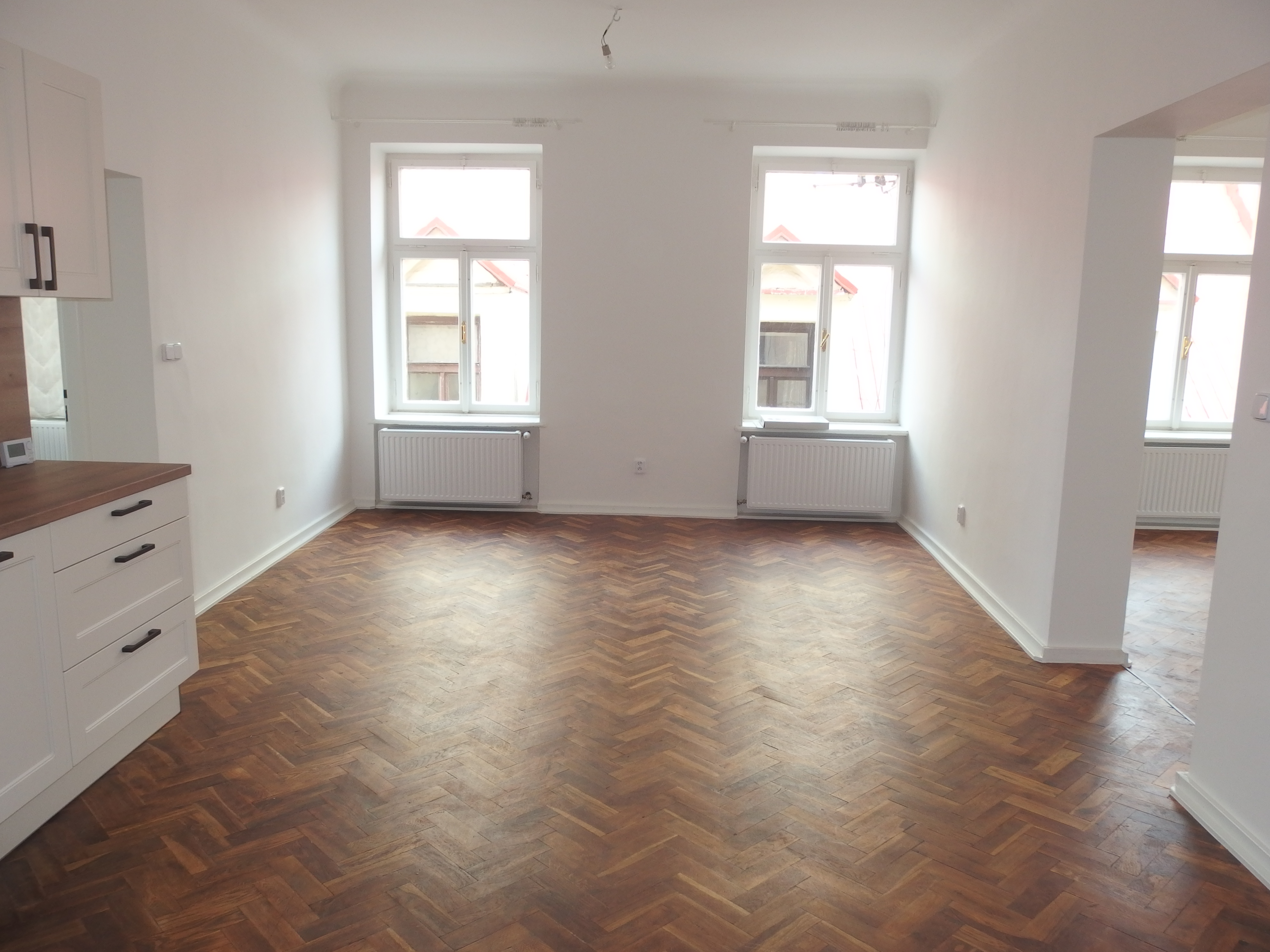 Pronájem bytu 4+kk, ca 110 m2, v centru Liberce, Sokolovské nám. 306/7. Jedná se o dlouhodobý pronájem nezařízeného bytu pro náročnou klientelu, ve kterém nyní byla dokončena kompletní a velice nákladná rekonstrukce – nová koupelna s obklady z masivní žuly, nová kuchyňská linka, komplet nové rozvody i odpady a v pokojích jsou dubové parkety. Vytápění i ohřev vody zajišťuje kombinovaný kotel na plyn.
